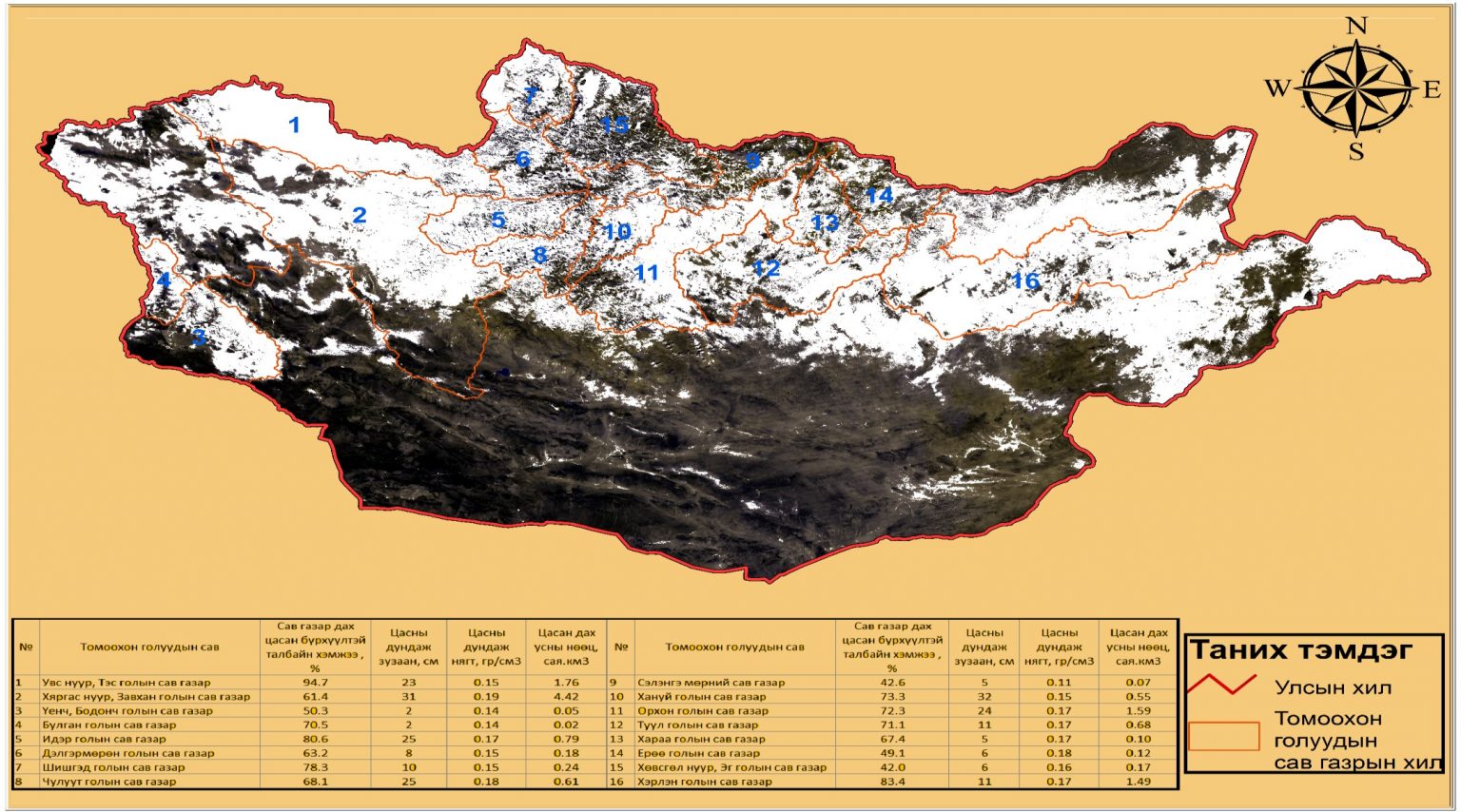 Монгол орны нийт газар нутгийн 49% нь цасан бүрхүүлтэй дундаж зузаан нь 18 см, цасан дахь усны нөөц 12.8 км3 …