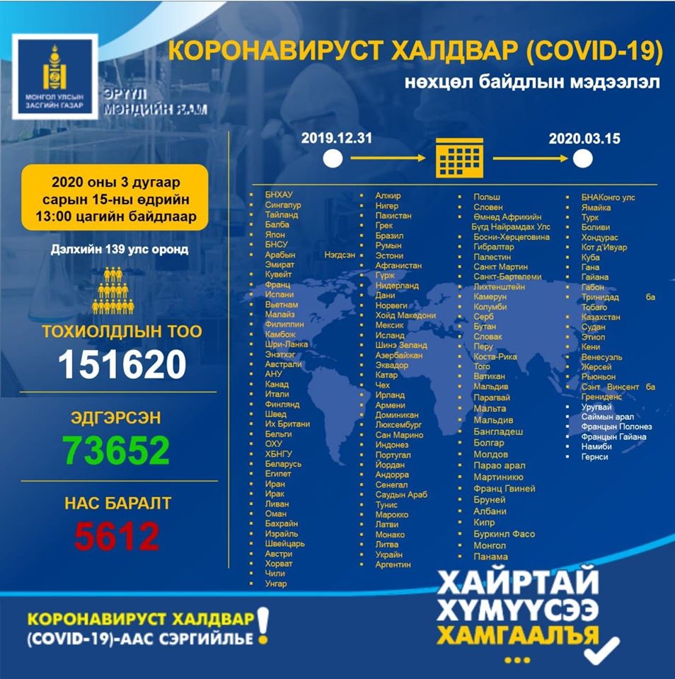 Шинэ коронавируст халдварын нөхцөл байдлын шинэчлэгдсэн мэдээлэл 3/15