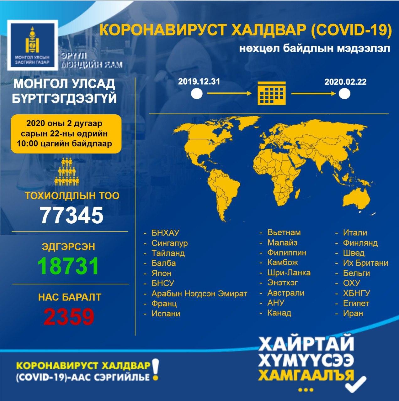 Эрүүл мэндийн яамнаас шинэ коронавируст халдварын нөхцөл байдлын мэдээллийг 2020 оны 02 дугаар сарын 22-ны өдрийн 10:00 цагийн байдлаар мэдээллээ.…