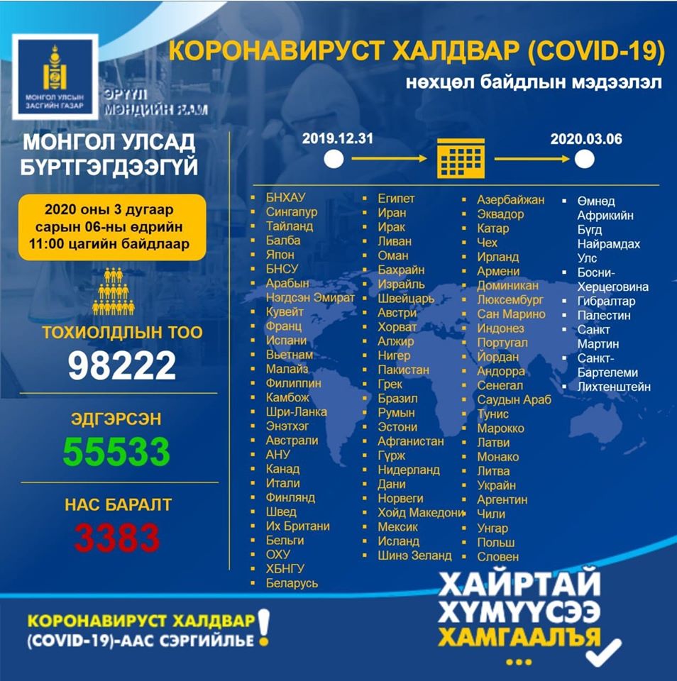 Коронавирусийн халдварт (COVID-19)-ын нөхцөл байдлын мэдээ /2020.03.06/