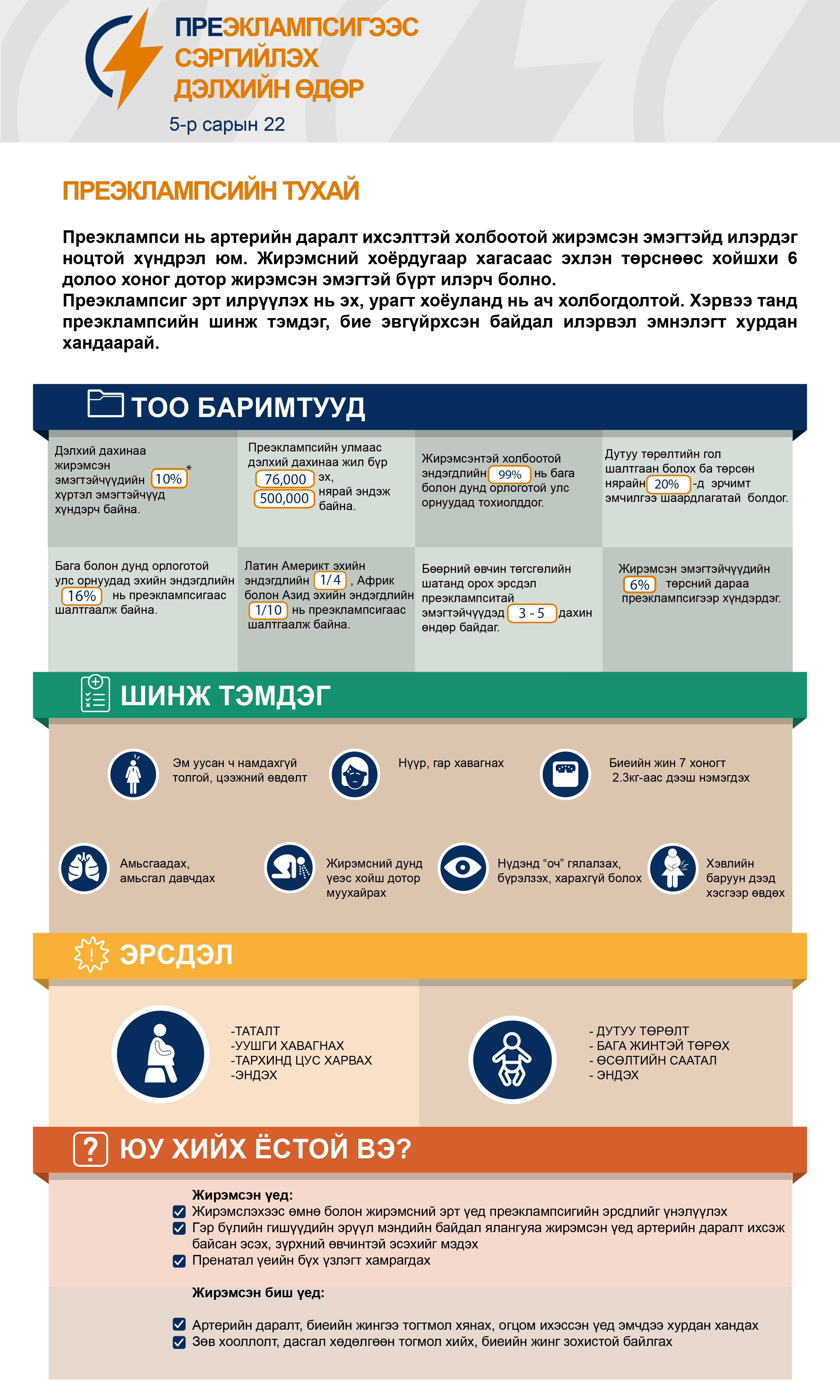 Преэклампсийн тухай Преэклампси нь артерийн даралт ихсэлттэй холбоотой жирэмсэн эмэгтэйд илэрдэг ноцтой хүндрэл юм. Жирэмсний хоёрдугаар хагасаас эхлэн төрснөөс хойшхи…