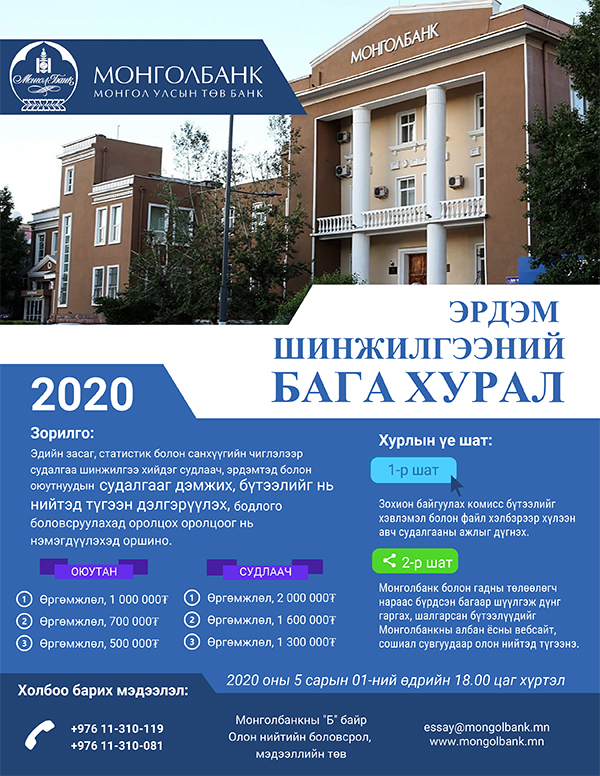 Монголбанкнаас санаачилсан эдийн засаг, статистик болон санхүүгийн чиглэлээр судалгаа шинжилгээ хийдэг судлаач, эрдэмтэд болон оюутнуудын судалгааг дэмжих, бүтээлийг нь нийтэд…