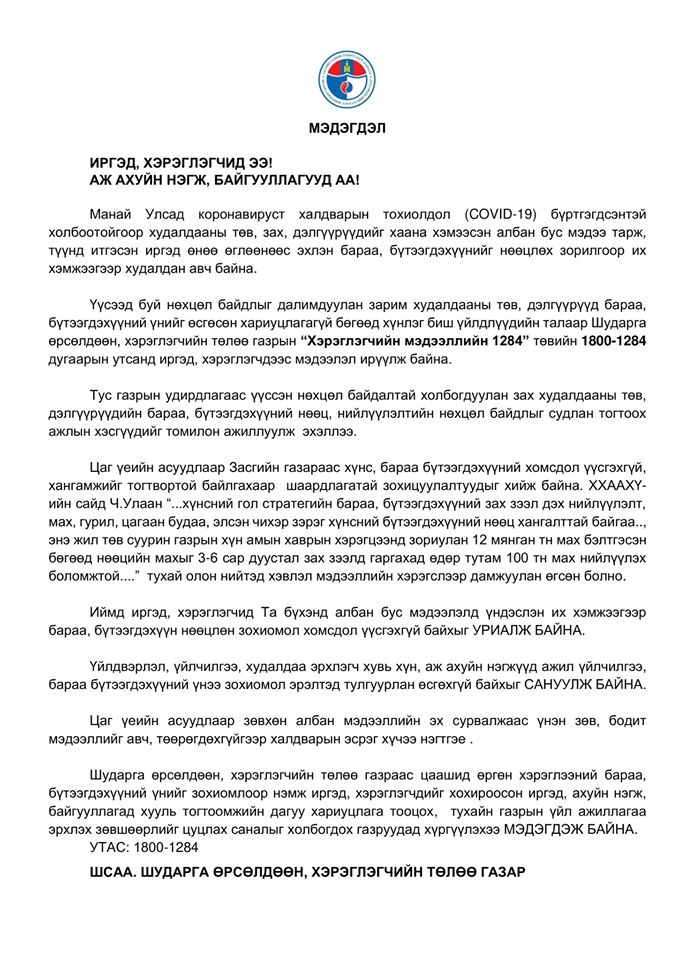 Нийслэлийн Онцгой комиссын шийдвэрээр дараах үйлчилгээний газруудын үйл ажиллагааг 2020 оны 03 сарын 16-ны өглөөний 07 цаг хүртэл түр хугацаагаар…