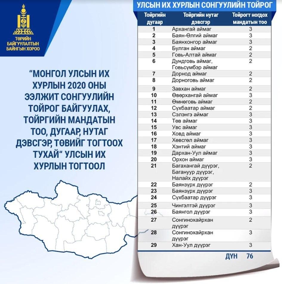 Монгол Улсын Их Хурлын 2020 оны ээлжит сонгуулийн тойрог байгуулах, тойргийн мандатын тоо, дугаар, нутаг дэвсгэр, төвийг тогтоох тухай” тогтоолын…