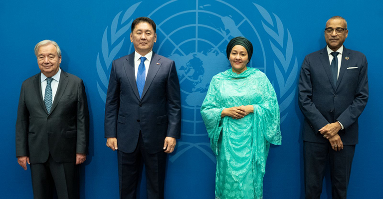 Монгол Улсын Ерөнхийлөгчийг НҮБ-ын Төв байранд хүрэлцэн ирэхэд НҮБ-ын Ерөнхий нарийн бичгийн дарга Антонио Гутерреш албан ёсоор угтав.