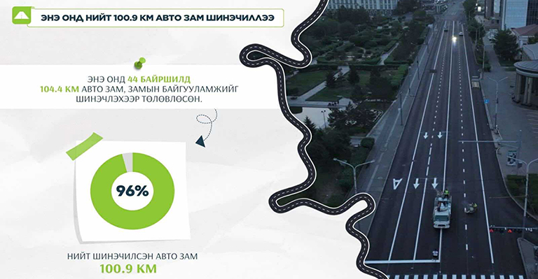 Энэ жилийн хувьд 1978 оноос хойш их засвар хийгээгүй 16 км Найрамдлын авто зам, 2008 оноос хойш их засвар хийгээгүй 8.9 км Энхтайваны өргөн чөлөөний авто замыг бүрэн шинэчиллээ.