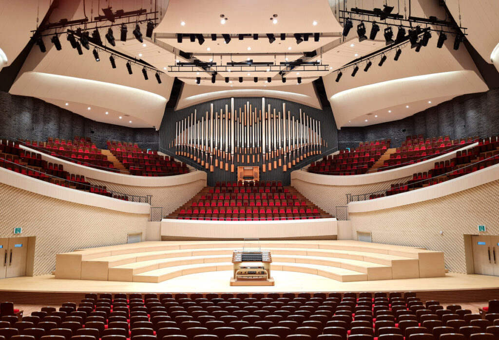 Тус театрын барилгыг гаднаас нь харвал далайн давлагааны рух буюу хөлөг онгоц далайд хөвж явах мэт үзэгдэх архитекторын онцгой шийдэл дээр пассадны өнгө, хийц материал нь далайн давалгааг санагдуулам аж. Дээш 3 давхар, газар доошоо нэг давхар баригджээ. Концертын том заал нь 2011 хүний суудалтай бол бага заал нь 400 үзэгчийн суудалтай гэнэ.