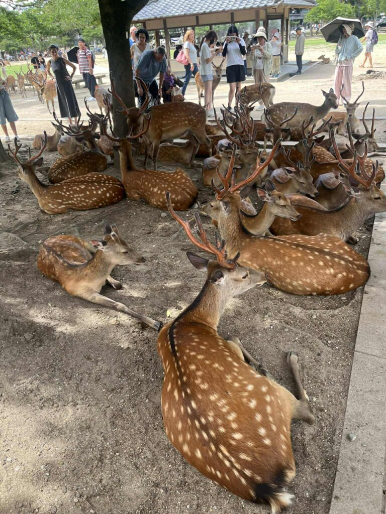 Аяллын өөр нэг хөтөлбөр бол мянган бугатай гэх Нарагийн цэцэрлэгт хүрээлэн байж таарсан. Тэндхийн цоохор буганууд яг л хүүхэд шиг. Гар дагуулж харна, хэний гар хоосон, хэнийх жигнэмэгтэйг андахгүй. Хэрэв гарт тань жигнэмэг бийг олж мэдвэл тэд таныг мөр алдахгүй дагана. Хүзүүгээ сунгаж тэмүүлнэ, нэгнээсээ өрсөх гэж үзнэ. Бүр болохгүй бол айлгах арга хэрэглэнэ. Гарт дахь жигнэмэг дуусах хүртэл янз янзаар үзнэ. Жигнэмэг олж идэх тэдний баараггүй дархан мэх бол зочдод бөхийх. Хэн гэгч анхнаасаа тийм аргад тэднийг сургасныг бүү мэд, задгай талбайн цирк шиг тэр үзүүлбэрт хөгшин хөвөөгүй амьтан сургагчаар татагдан оролцоно. Зарим нь бүр жигнэмэгээ тараагаад дууссан болохоор ховдог нэгэнд нь хэрхэн ойлгуулахаа мэдэхгүй, арга чаргаа барж байгаа бололтой гараа савчуулангаа тайлбарлаж ч харагдах шиг.