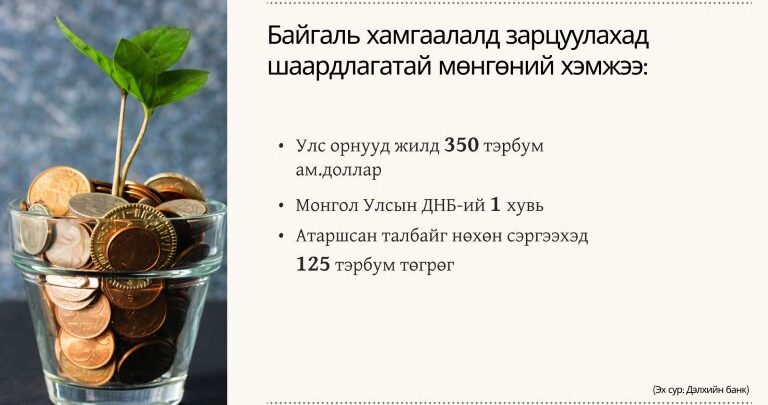 Дэлхийн банкны мэргэжилтнүүдийн гаргасан тооцооллоос сонирхуулая. Улс орнууд жилд хамгийн багадаа 350 тэрбум ам.долларыг байгаль хамгаалахад зарцуулбал хүлэмжийн хийг багасгаж, ган цөлжилтийг сааруулж чадна гэж мэдэгдсэн. Харин манай эрдэмтдийн тооцоогоор Монгол Улс ДНБ-ийхээ ядаж 1%-ийг байгаль орчны хамгаалалд зарцуулах хэрэгтэй гэж үзэж байгаа юм. Цаашлаад Монгол орны хэмжээнд зөвхөн атаршсан талбайг нөхөн сэргээхэд л 125 тэрбум төгрөг шаардлагатай гэсэн тооцоо ч байдаг.