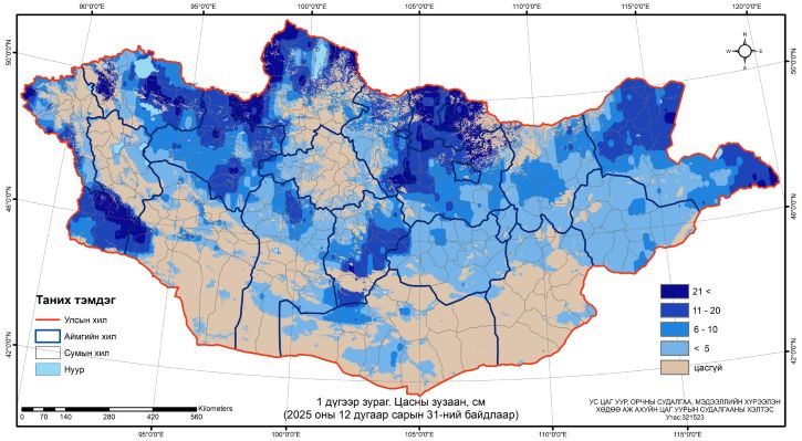 Ус цаг уур, орчны судалгаа, мэдээллийн хүрээлэнгээс арав хоногт нэг удаа хийдэг хээрийн цасны хэмжилтийн мэдээгээр 12 дугаар сарын 31-ний байдлаар нийт нутгийн 74 хувьд цастай байгаагаас цасны зузаан хамгийн ихдээ Увсын Ховд, Завханы Цэцэн-Уул, Хөвсгөлийн Цэцэрлэг сумдын нутгаар 30-40 см байна. Цасан бүрхүүлийн хэмжээг өмнөх арван хоногтой харьцуулахад 5 хувиар багассан байна.