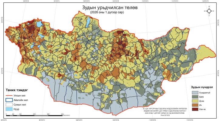 Ус цаг уур, орчны судалгаа, мэдээллийн хүрээлэнгээс нэгдүгээр сарын зудын урьдчилсан төлөвийг газрын ажиглалтын болон хиймэл дагуулын мэдээ болох ган, зуншлага, 2025-2026 оны өвөл-хаврын бэлчээрийн даац, бэлчээрийн ургац, агаарын температур, хур тунадасны дундажтай харьцуулсан хазайлт, цасны зузаан болон нэгдүгээр сарын агаарын температур, хур тунадасны урьдчилсан төлөв зэрэг мэдээлэлд үндэслэн боловсрууллаа.