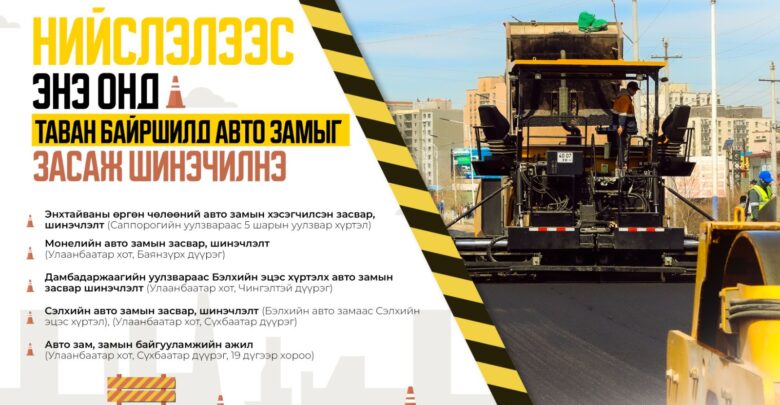 Нийслэлээс 2026 онд 52 км авто замыг шинээр барьж, таван байршилд авто замын засвар шинэчлэлтийг хийнэ. Авто замын засвар шинэчлэлтийг дөрөвдүгээр сарын 1-нээс эхэлнэ. Нийслэлийн хэмжээнд 2024 оны есдүгээр сараас 2025 оны есдүгээр сар хүртэл нэг жилийн хугацаанд 86 байршилд 233 км авто замыг шинэчилж байв. Тэгвэл энэ онд засвар шинэчлэлт хийх авто замын талаар мэдээлэл хүргэж байна.