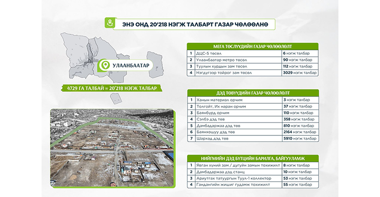 Мөн он дамжин хэрэгжиж буй авто зам, инженерийн шугам сүлжээний төслүүдийн хүрээнд 24 байршилд газар чөлөөлөлт үргэлжилнэ. 2025-2026 он дамжин 1330 нэгж талбарт газар чөлөөлөхөөс 2025 онд 655 нэгж талбарыг чөлөөлсөн. 2026 онд 675 нэгж талбарыг чөлөөлнө.