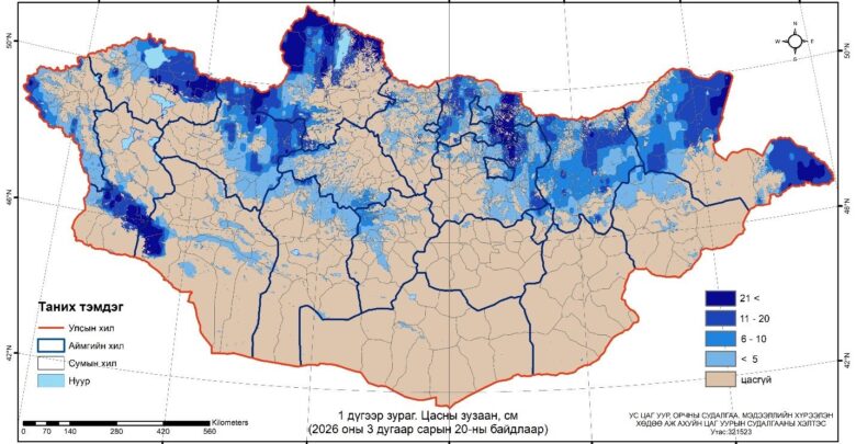 Ус цаг уур, орчны судалгаа, мэдээллийн хүрээлэнгээс арав хоногт нэг удаа хийдэг хээрийн цасны хэмжилтийн мэдээгээр гуравдугаар сарын 20-ны байдлаар нийт нутгийн 34 хувьд цастай байна.
