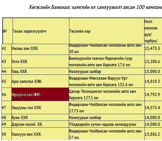 Мөн Хөгжлийн банкнаас хамгийн их зээл авсан компаниудыг ч тэргүүлсэн байгаа юм. Ингэхдээ хоёр удаагийн зээлээр 27.9 тэрбум төгрөгийн зээл авсан байна. Өөрөөр хэлбэл Баянзүрх захын эзэн, АН-ын гишүүн Ишбадамын Нарантуяа нийтдээ 46.9 тэрбум төгрөгийг “Хөгжлийн банк”, “Чингис бонд”-оос авч төрөөс төрсөн тэрбумтнуудыг өнгөлж эхэллээ.