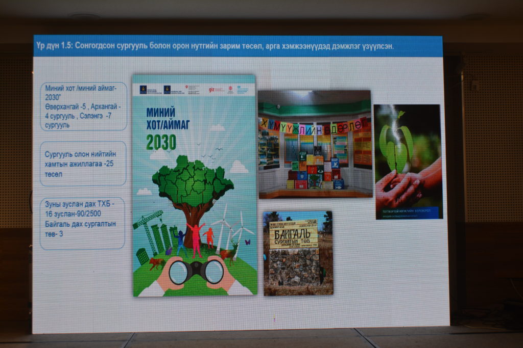 2015 оноос эхлэн хэрэгжсэн уг төслийн хэрэгжүүлэгчээр Германы олон улсын Хамтын ажиллагааны нийгэмлэг /GIZ/, Шведийн Усалагийн их сургууль, Швейцарийн IZB хамтарсан консорциум хамтран ажилласан байна. Тус арга хэмжээний үеэр орон нутгуудад хийгдсэн ажлын үйл явцыг харуулсан бичлэг, төслийн бүрэлдэхүүн хэсгүүдийн онцлох үр дүн, ногоон хөгжил, тогтвортой хөгжлийн чиглэлээр БОАЖЯ-тай хамтран хийсэн ажлууд, гарсан үр дүн, БСШУСЯ-тай хамтран ерөнхий боловсролын сургуулиудад нэвтрүүлсэн үйл ажиллагааны явц үр дүнг танилцууллаа.