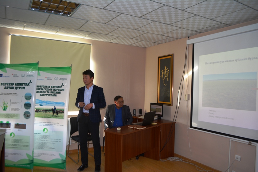 Түүний дараа Дундговь аймгийн АБАХ-ын гүйцэтгэх Захирал Г.Дашбалдан Ногоон алт малын эрүүл мэнд төсөл хэрэгжсэн сумдад гарсан ололт амжилтын талаар мэдээлэл өглөө. МБАНХ-ны зүгээс тус аймагт Бэлчээр ашиглах журмын төсөл” боловсруулахад мэргэжил арга зүйн зөвөлгөө өглөө. МБАНХ-ны зөвлөх Б.Мэнджаргал “МБАНХ-ны зорилго, үйл ажиллагааны чиглэл, бэлчээрийн менежмэнт дахь малчдын байгууллагын үүрэг оролцоо” сэдвээр, МБАНХ-ны зөвлөх Л.Ганцогт “Бэлчээр ашиглалтыг ургамлын сэргэх чадавхи болон ашиглагчдын оролцоотой сэргээх нь”, “Бэлчээр ашиглах гэрээ журмаар дамжуулан ашиглалтыг хариуцлагажуулах” сэдвээр, МБАНХ-ны Хоршоо, дундын сан хариуцсан мэргэжилтэн Г.Цэрэндолгор “Дундын сан, түүний ажиллагаа” сэдвээр мэдээлэл өглөө.