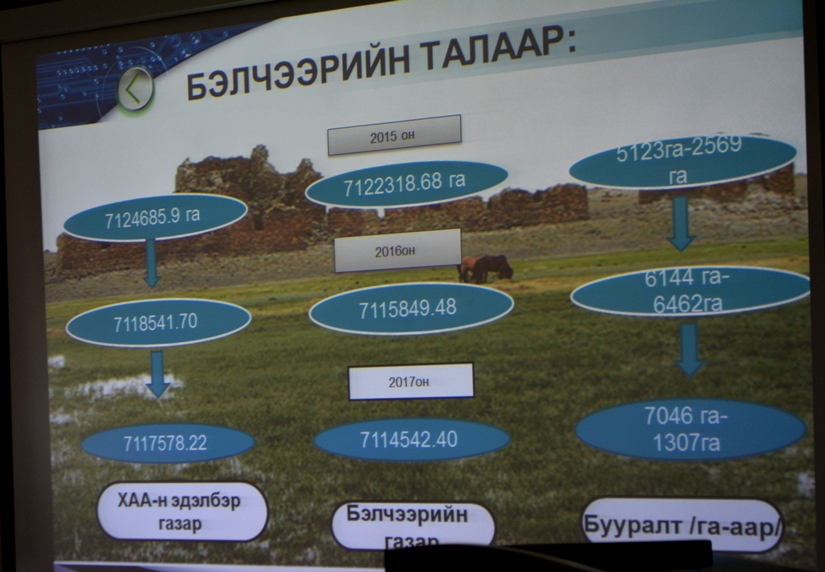 Зөвлөгөөний эхний хэсэгт Дундговь аймгийн Газар зохион байгуулалтын ерөнхий төлөвлөгөө, ХАА-н газар түүний өнөөгийн байдал арга хэмжээний талаар Дундговь аймгийн ЗДТГ-ын Хөрөнгө оруулалт, хөгжлийн бодлого, төлөвлөлтийн хэлтсийн дарга Н.Эрдэнэ-Очир товч мэдээлэл өгсөн. Тэрбээр хэлэхдээ “Дундговь аймгийн хувьд 3,6 сая толгой малтай, бэлчээрийн даац 2-3 дахин нэмэгдсэн, ашигт малтмалын эрэл хайгуулын ажилтай холбоотой том оврын автомашин бэлчээрийг ихээр талхалж, малчдын мал маллагаа явуулахад саад бэрхшээл учруулж байгаа аж. Түүнчлэн тус аймагт ашигт малтмалтай холбоотой 200 гаруй хайгуулын болон ашиглалтын зөвшөөрөлтэй аж ахуйн нэгж байдаг, мөн түгээмэл тархацтай ашигт малтмалын зөвшөөрөл хүссэн хүсэлт 40 гаруй ирсэн.