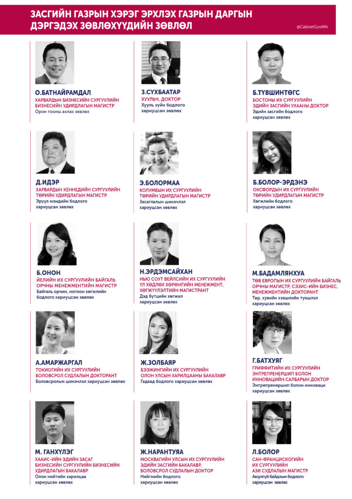 1. О.БАТНАЙРАМДАЛ– Орон тооны Ахлах зөвлөх /ХАРВАРДЫН БИЗНЕСИЙН СУРГУУЛИЙН БИЗНЕСИЙН УДИРДЛАГЫН МАГИСТР/