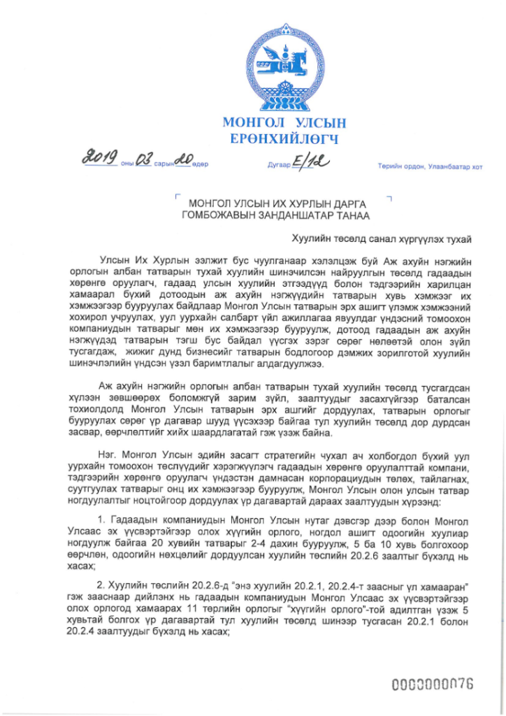 “…Энэхүү хуулийн төсөлд гадаадын хөрөнгө оруулагч, гадаад улсын хуулийн этгээдүүд болон тэдгээрийн харилцан хамаарал бүхий дотоодын аж ахуйн нэгжүүдийн татварын хувь хэмжээг их хэмжээгээр бууруулах байдлаар Монгол Улсын татварын эрх ашигт үлэмж хэмжээний хохирол учруулах, уул уурхайн салбарт үйл ажиллагаа явуулдаг үндэсний томоохон компаниудын татварыг мөн их хэмжээгээр бууруулж, дотоод гадаадын аж ахуйн нэгжүүдэд татварын тэгш бус байдал үүсгэх зэрэг сөрөг нөлөөтэй олон зүйл тусгагдаж, жижиг дунд бизнесийг татварын бодлогоор дэмжих зорилготой хуулийн шинэчлэлийн үндсэн үзэл баримтлалыг алдагдуулжээ…” гэж үзсэн тул хуулийн төсөлд саналаа хүргүүлэв.