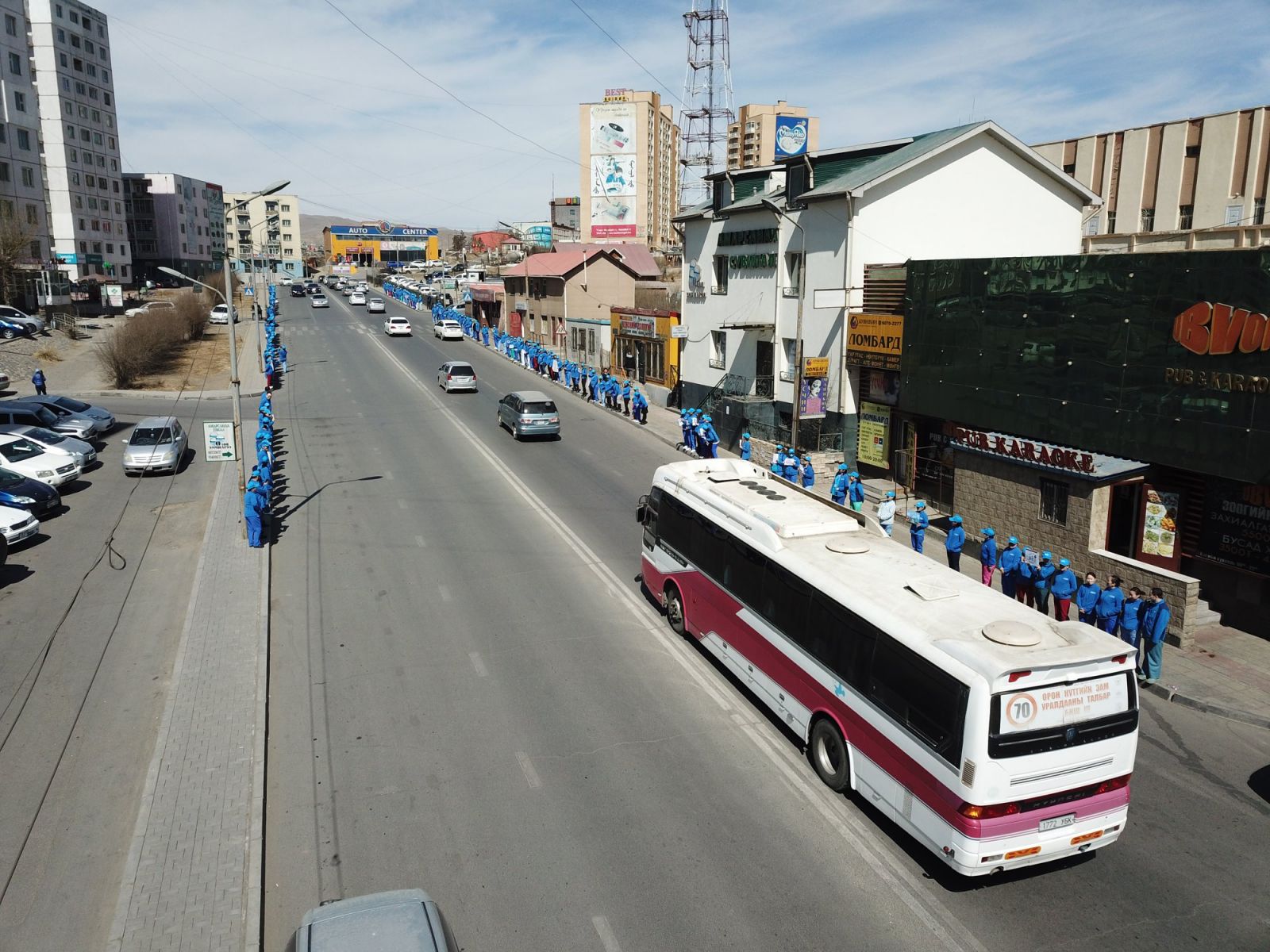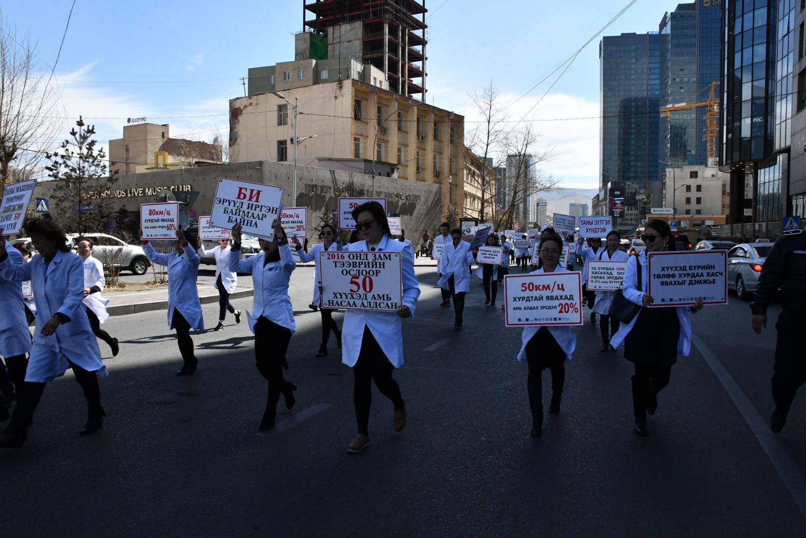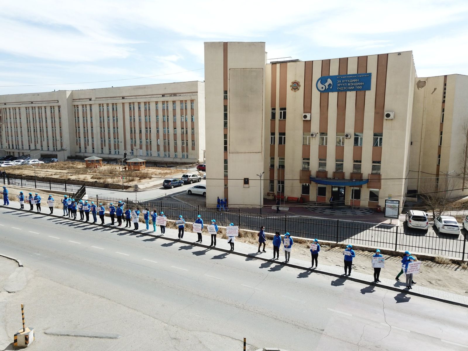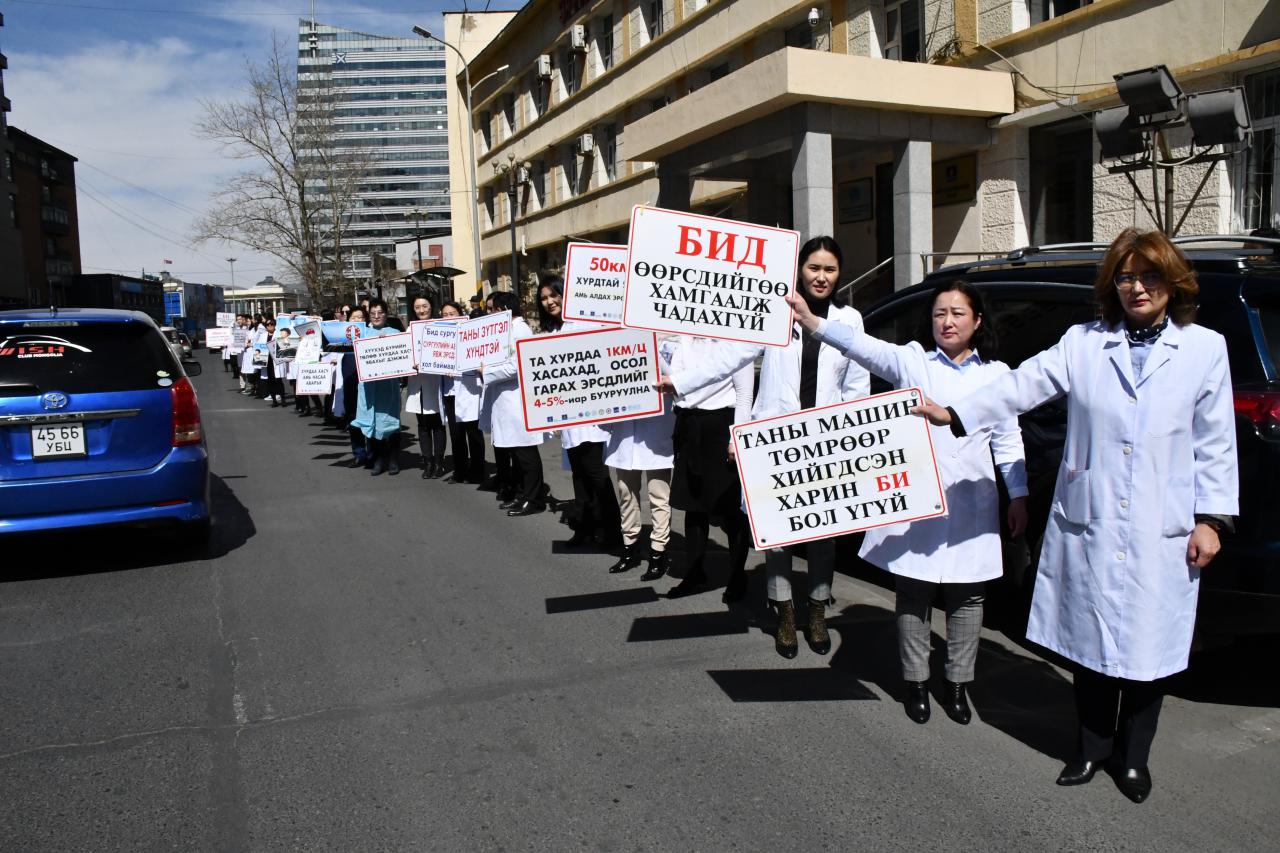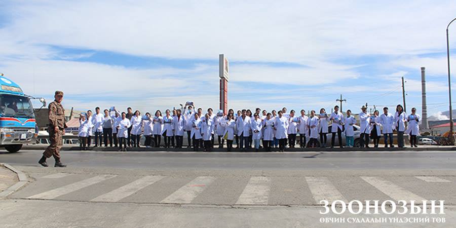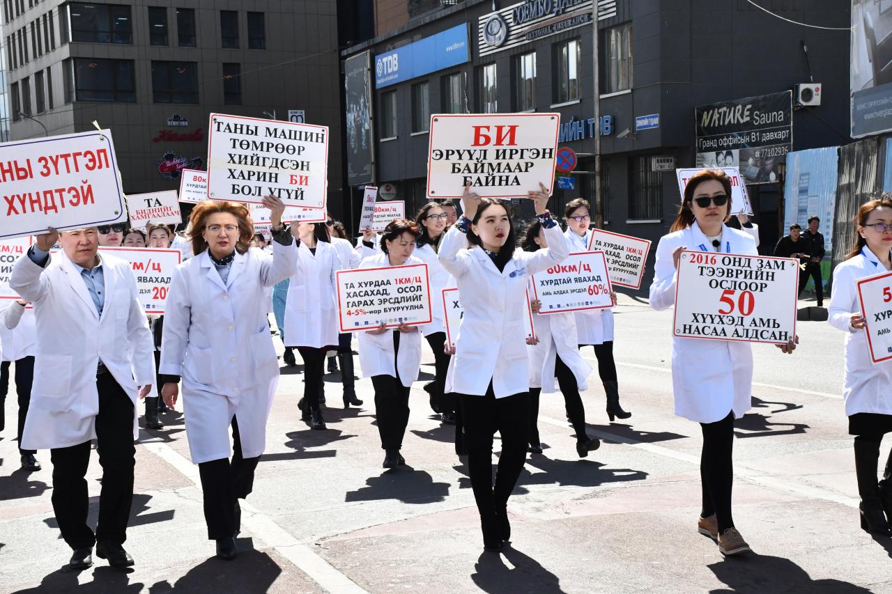“АВТО ОСЛООР АЛАГ ҮРСЭЭ АЛДСААР БАЙХ УУ” уриан дор өнөөдөр Эрүүл мэндийн салбарын бүх эмч, эмнэлгийн ажилчид цагаан халадтай байгууллагынхаа гаднах талбай болон ойролцоох автозамын дагуу осол, гэмтлээс сэргийлэх уриалга, улаан өнгийн анхааруулга тэмдэг бүхий лоозон барьж, дуу хоолойгоо нэгтгэн жагслаа.