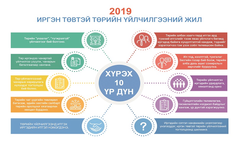 Засгийн газрын 2019 оны 01 дүгээр сарын 16-ны өдөр ээлжит хуралдаанаар 2019 оныг “Иргэн төвтэй төрийн үйлчилгээний жил” болгон зарлаж, хэрэгжүүлэх арга хэмжээний төлөвлөгөөг баталсан билээ.