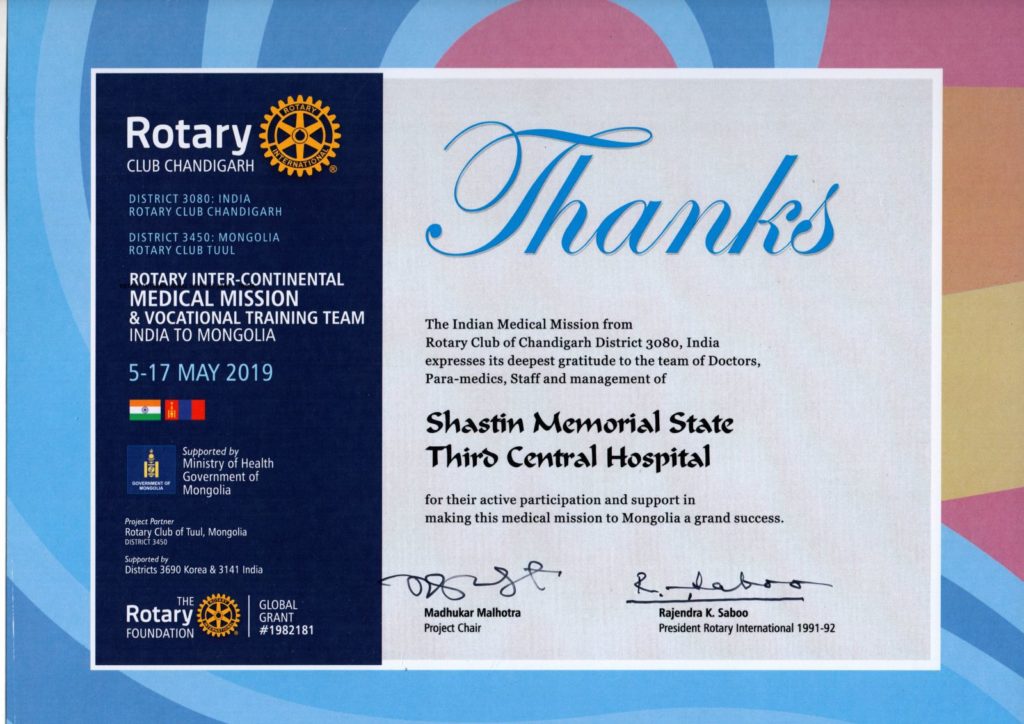 Улсын гуравдугаар төв эмнэлэг дээр ОУ-ын Ротари байгууллагын 3080 дугаар дүүргийн Чиндигар болон 3450 дугаар дүүргийн Туул Ротари клубүүд хамтарсан Олон улсын Ротари сангийн санхүүжилттэй “Глобал Грант # 1982181” төсөл амжилттай хэрэгжлээ.