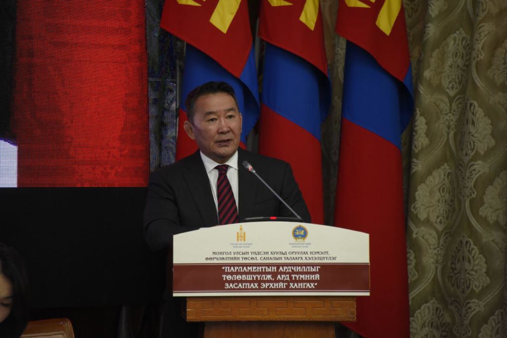 Монгол Улсын Үндсэн хуульд оруулах нэмэлт, өөрчлөлтийн төслийн талаарх “Парламентын ардчиллыг төлөвшүүлж, ард түмний засаглах эрхийг хангах нь” сэдэвт хэлэлцүүлгийг нээж Монгол Улсын Ерөнхийлөгч Халтмаагийн Баттулга үг хэллээ.