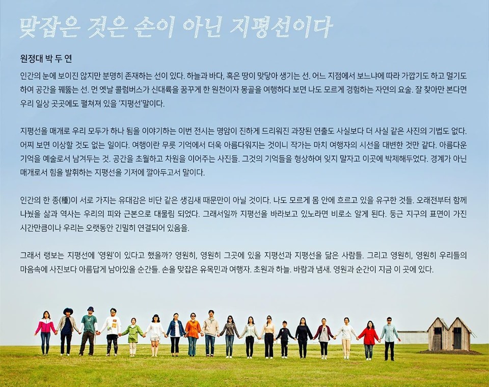 Солонгос улсын гэрэл зурагчин Sean Pyo хэлэхдээ “2015 онд Монголд ирээд Говийн аялал хийж явахдаа ийм үзэсгэлэн гаргах хэрэгтэй гэдгийг мэдэрсэн. Яагаад гэвэл ийм сайхан байгалийг ганцаараа үзэх нь харамсалтай байсан. Тэр үеэс л Монголын хязгааргүй зураасыг олж харсан. Соонгост бол тийм зураасыг харна гэдэг хэцүү зүйл. Хязгааргүй зураас дээр янз бүрээр хүмүүсийг зогсоох юмсан гэж боддог байсан. Тэгээд л өөр цаг хугацаанд өөр аймагт, өөр өөр үйл явдалтай хүмүүсийн зургийг авахыг хүссэн.