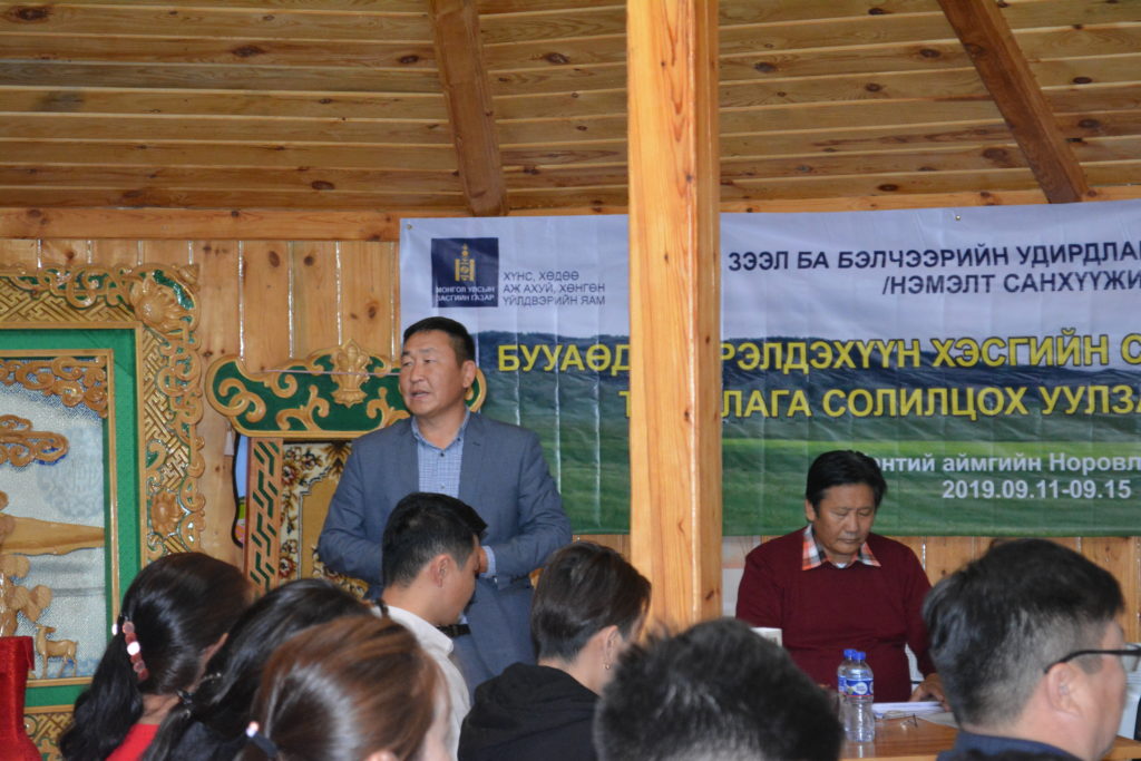 2019-2021 оны хооронд хэрэгжих энэхүү төслийн хүрээнд “Бэлчээрийн удирдлага, уур амьсгалын өөрчлөлтөд дасан зохицох бүрэлдэхүүн хэсгийн сумдын ажилтнуудын туршлага солилцох уулзалт, зөвлөгөөн” Хэнтий аймгийн Норовлин суманд өнөөдөр эхэлж байна. Тав хоног үргэлжлэх энэхүү туршлага солилцох уулзалт, зөвлөгөөнд ЗЗБУХТ бүрэлдэхүүн хэсгийн зохицуулагч Т.Цэдэндамба, Норовлин сумын Засаг дарга П.Алтангэрэл, ХААСМХОТ төвийн тэргүүн доктор Б.Биньеэ, МБАНХ-ны Гүйцэтгэх захирал Н.Ганхуяг тэргүүтэй төслийг хамтран хэрэгжүүлэх багийн гишүүд болон төсөл хэрэгжиж буй 6 аймгийн 18 сумын төслийн ажлыг хариуцсан мэргэжилтнүүд оролцож байна.