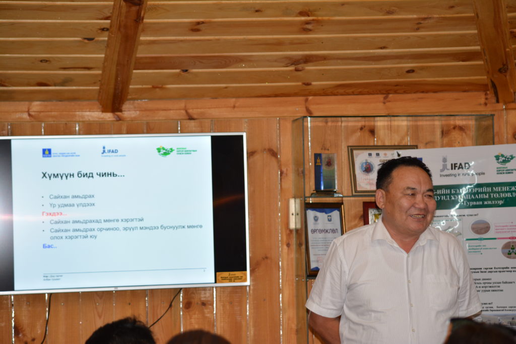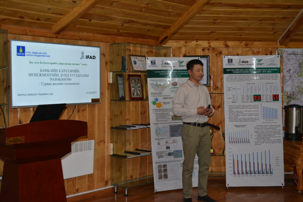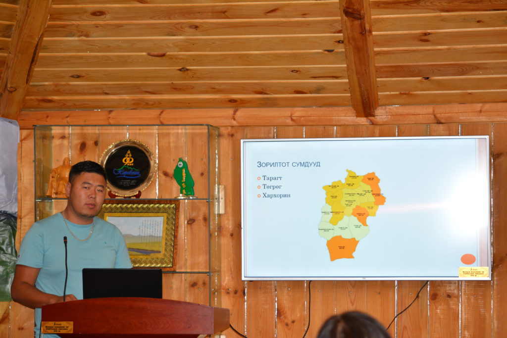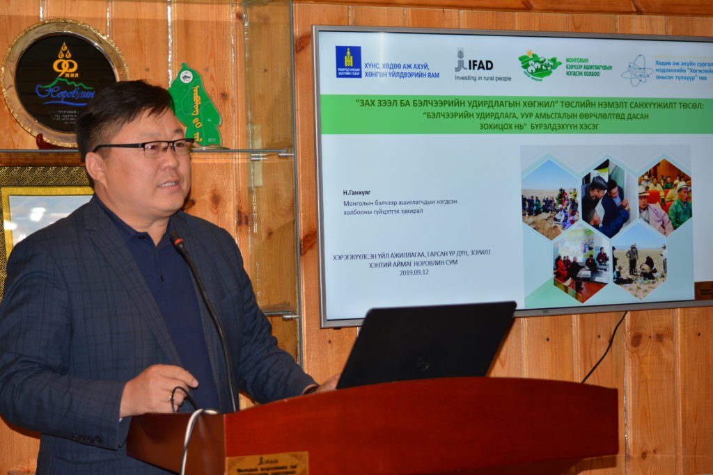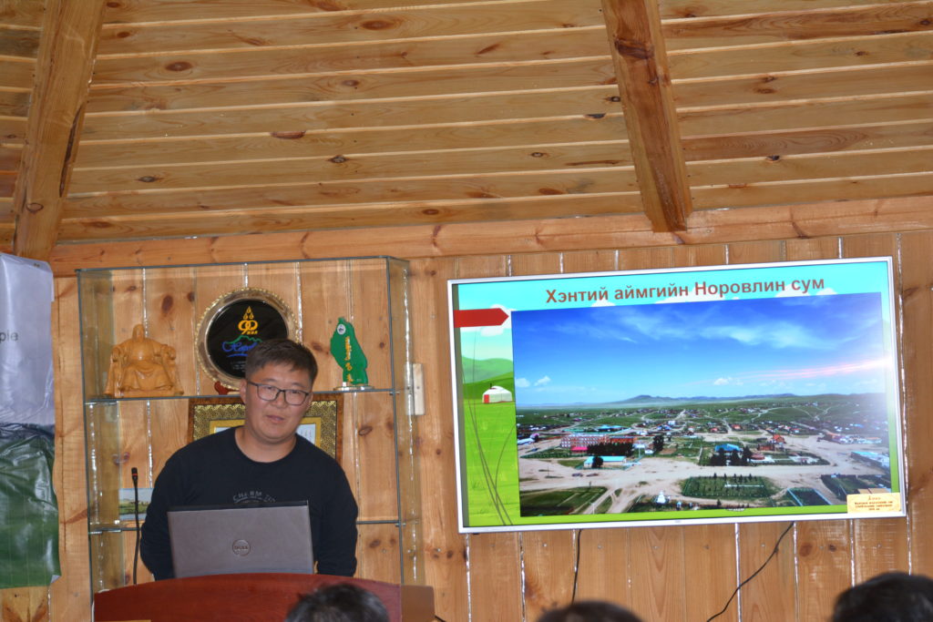 Туршлага солилцох уулзалт зөвөлгөөнөөр ЗЗБУХТ бүрэлдэхүүн хэсгийн зохицуулагч Т.Цэдэндамба сумдад Бэлчээр ашиглалтын Малчдын бүлэг /БАМБ/ байгуулагдсан талаар мэдээлэл, танилцуулга хийж, Норовлин сумын Засаг дарга П.Алтангэрэл төсөл хэрэгжсэнээр сум орон нутагт ямар амжилттай ажлууд хийгдэж, үр дүнд хүрч байгаа талаар мэдээлэл өгөв. МБАНХ-ны Гүйцэтгэх захирал Н.Ганхуяг төслийн хүрээнд хэрхэн хамтран ажиллаж байгаа талаар мэдээлэл өглөө.