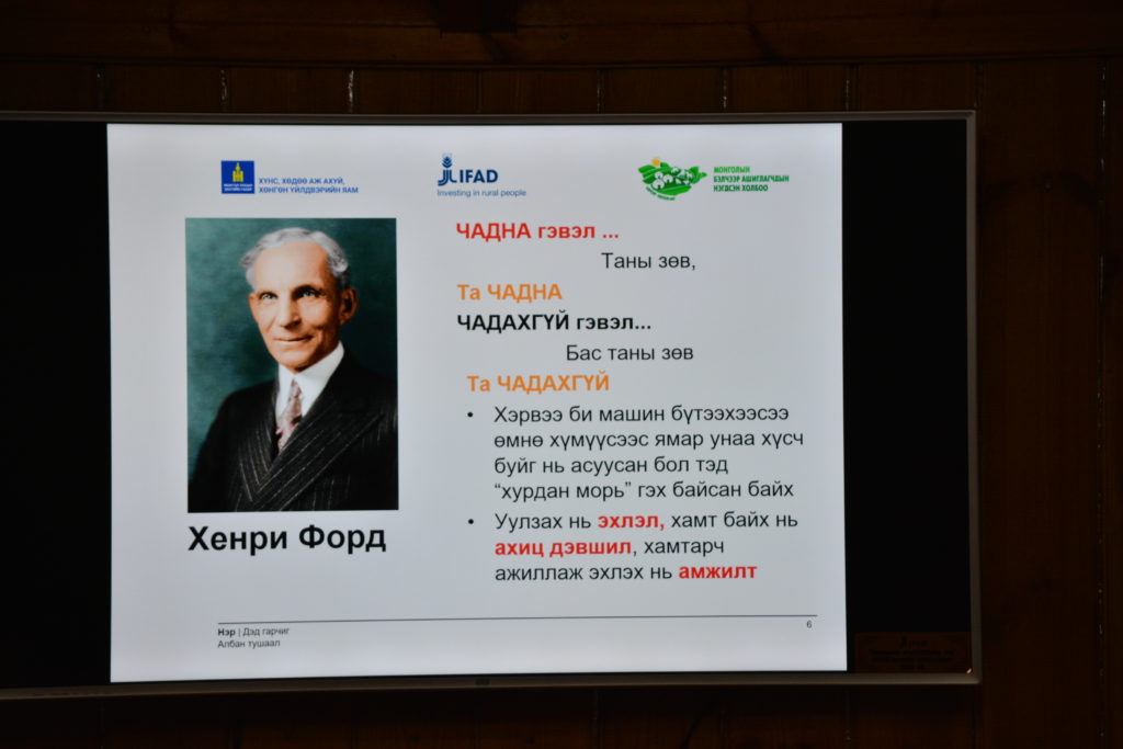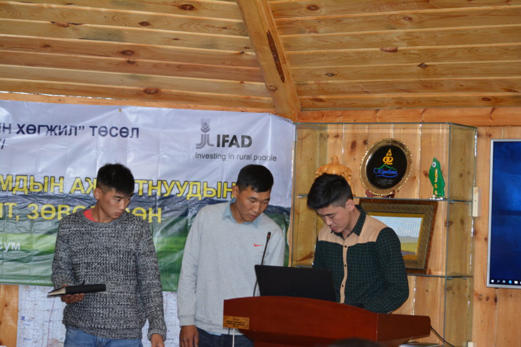 Төслийн багийнханы үндсэн мэдээллийн дараа төсөлд хамрагдаж байгаа аймаг сумдад гарч байгаа амжилт, үр дүн, цар хүрээ, цаашид үйл ажиллагаагаа илүү сайжруулахад юу ндээр анхаарах, ололт амжилтын талаар танилцуулга хийж, туршлага хуваалцаж байна.
