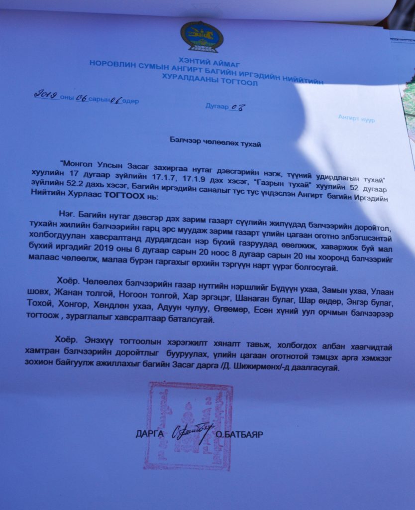 Багийн хурлаар хэлэлцээд “Бэлчээрийг бүрэн утгаар нь чөлөөлье” гэж тохирсон. Ингэхдээ төлөвлөсөн газраасаа дахин 3 км илүү гадагш тэлж хилийн зааг тогтоосон. Тэгээд айл өрхүүдээр явж, багийн хурлын шийдвэрийг хэлж, хил хязгаар нутаг нь энэ байна, эндээс гадагш бэлчээрээ чөлөөлөх хэрэгтэй гэдгийг зураг үзүүлэн сануулах уулзалт хийсэн. Манай багийн нутаг дэвсгэрт 70 өрх байдаг, зундаа отроор ирсэнтэйгээ 80 аад өрх болдог. Нийт 227 гектар талбайд 70 өрх чөлөөтэй бэлчээрлээд байх нутагтай усаа бараадаж амьдарч ирсэн. Тиймээс газрын зургаар зааж энэ газраа чөлөөлж, нүүх боломжтой гэж устай цэгүүдээ тогтоож харуулсан.