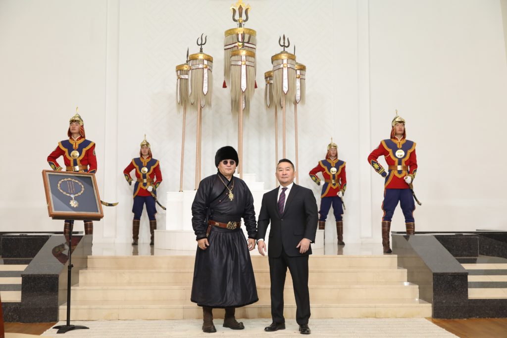 Монгол Улсын Ерөнхийлөгчийн зарлигийг уншиж сонордуулсны дараа Монгол Улсын Ерөнхийлөгч Х.Баттулга жаазанд тусгайлан суулгасан “Чингис хаан” одонг “Хү” хамтлагийн төлөөлөл болгон продюсер Б.Дашдондогт гардууллаа.