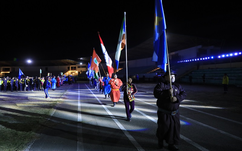 Төрийн далбааг Монгол Улсын гавъяат дасгалжуулагч, Монгол Улсын гавьяат жүжигчид болон Эрдэнэт хотоос төрөн гарсан урлаг спортын алдартнууд мандуулж анхдугаар их наадмын бамбарыг асаалаа. Бамбарыг Хүүхдийн спортын VI их наадмын алтан медальт шилдэг тамирчид өртөөчлөн дамжуулан Атлантын олимпын хүрэл медальт, Монгол Улсын гавьяат тамирчин Д.Нармандахад гардуулан өгснөөр наадмын анхны бамбар аслаа.