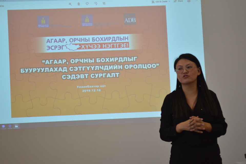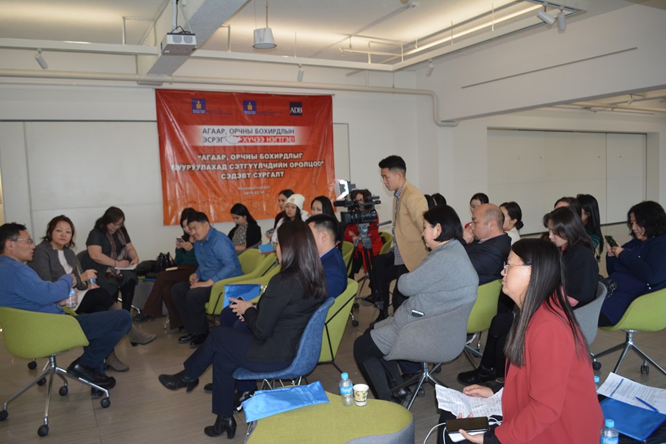 Байгаль орчин аялал жуулчлалын яам, Орчны бохирдлыг бууруулах үндэсний хороо, Азийн хөгжлийн банк хамтран хэрэгжүүлж буй Агаарын бохирдлыг бууруулахад иргэдийн оролцоог нэмэгдүүлэх зорилготойгоор компанит ажил, арга хэмжээнүүдийг үе шаттайгаар зохион байгуулсаар байна. Уг ажлын хүрээнд “MN17 Галерей”-д “АГААРЫН БОХИРДОЛЫГ БУУРУУЛАХАД СЭТГҮҮЛЧДИЙН ОРОЛЦОО” сэдэвт сургалт /2019.12.18/ зохион байгуулж, телевиз, өдөр тутмын сонин, сайтын 30 орчим сэтгүүлч оролцож сертификат гардлаа.