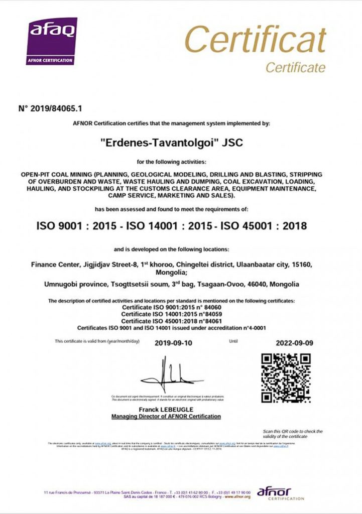 “Эрдэнэс-Тавантолгой” ХК нэгдсэн менежментийн тогтолцооны стандартуудыг үйл ажиллагаандаа нэвтрүүлэн хэрэгжүүлж, дэлхийд тэргүүлэгч Франц Улсын Афнор группээс баталсан баталгаажуулалтын гэрчилгээтэй боллоо. Бүгд Найрамдах Франц улсаас Монгол Улсад суугаа Онц бөгөөд бүрэн эрхт Элчин сайд Филиппе Мерлин энэхүү баталгаажуулалтын гэрчилгээг компанийн төлөөлөлд 2019 оны 9 дүгээр сарын 27-ны өдөр гардуулсан юм. Мөн энэ үеэр “Эрдэнэс-Тавантолгой” ХК-ийн 12 ажилтан Афнорт бүртгэлтэй Чанарын удирдлагын тогтолцооны ISO 9001 стандартын тэргүүлэх аудиторуудын гэрчилгээгээ хүлээн авлаа.