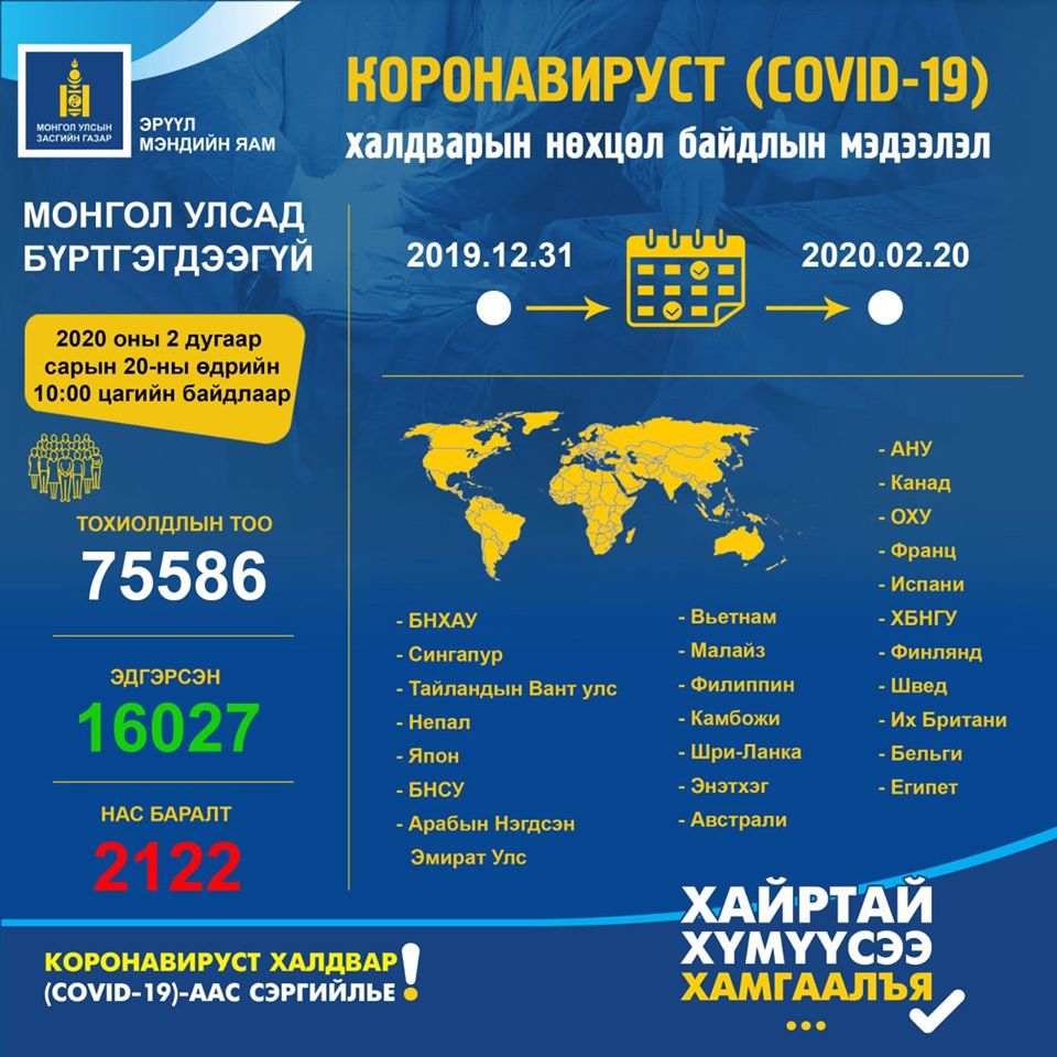 Эрүүл мэндийн яамнаас шинэ коронавируст халдварын нөхцөл байдлын мэдээллийг 2020 оны 02 дугаар сарын 20-ны өдрийн 10:00 цагийн байдлаар мэдээллээ. Тус өвчнөөр 2122 хүн нас бараад байна. Халдвар авсан хүний тоо 75586-д хүрсэн бол 16027 хүн эдгэрчээ.