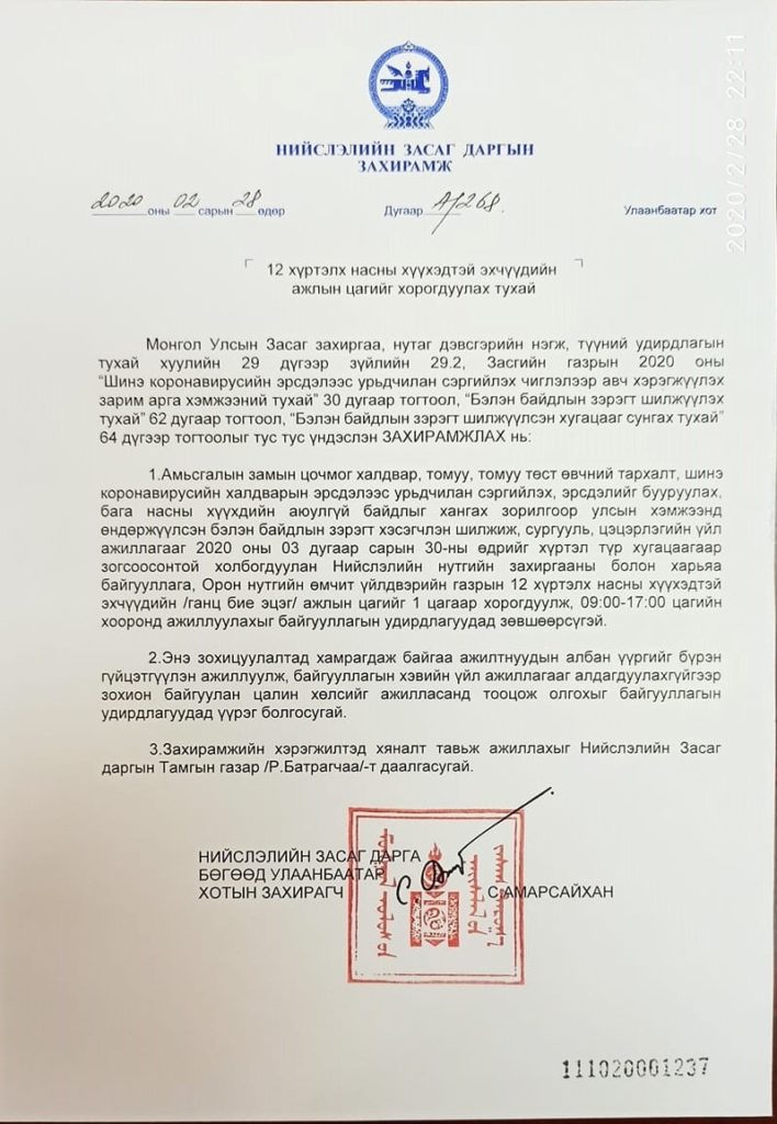 Энэхүү шийдвэртэй холбогдуулан эцэг эхчүүд нь бага насны хүүхдүүдээ орхиж ажлаа эрхлэх болсноор гэртээ үлдэж байгаа хүүхэд багачууд аливаа эрсдэлд өртөж болзошгүй байдал үүсэж байгаатай холбогдуулан өнөөдөр нийслэлийн Засаг дарга бөгөөд Улаанбаатар хотын захирагч С.Амарсайхан “12 хүртэлх насны хүүхэдтэй эхчүүдийн ажлын цагийг хорогдуулах тухай” А/268 тоот захирамжийг гаргалаа.