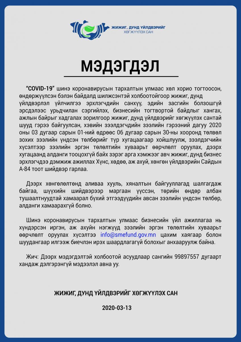 “COVID-19” шинэ коронавирусын тархалтын улмаас хөл хорио тогтоосон, өндөржүүлсэн бэлэн байдалд шилжсэнтэй холбоотойгоор жижиг, дунд үйлдвэрлэл үйлчилгээ эрхлэгчдийн санхүү, эдийн засгийн болзошгүй эрсдэлээс урьдчилан сэргийлэх, бизнесийн тогтвортой байдлыг хангах, ажлын байрыг хадгалах зорилгоор жижиг, дунд үйлдвэрийг хөгжүүлэх сантай шууд гэрээ байгуулсан, хэвийн зээлдэгчдийн зээлийн гэрээний дагуу 2020 оны 03 дугаар сарын 01-ний өдрөөс 06 дугаар сарын 30-ны хооронд төлвөл зохих зээлийн үндсэн төлбөрийг түр хугацаагаар хойшлуулж, зээлдэгчийн хүсэлтээр зээлийн эргэн төлөлтийн хуваарьт өөрчлөлт оруулах, дээрх хугацаанд алданги тооцохгүй байх зэрэг арга хэмжээг авч жижиг, дунд бизнес эрхлэгчдээ дэмжиж ажиллах Хүнс, хөдөө, аж ахуй, хөнгөн үйлдвэрийн Сайдын А-84 тоот шийдвэр гарлаа.