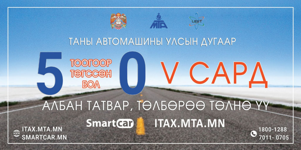 Иргэн та цаг заваа хэмнэж www.itax.mta.mn, www.smartcar.mn цахим хуудсаар дамжуулан төлбөрөө төлөөрэй. Та авто тээврийн болон өөрөө явагч хэрэгслийн албан татвар, агаар бохирдлын төлбөр, авто зам ашигласны төлбөрийг онлайнаар төлсөн бол төлбөрийн баримтаа хэвлэж, тээврийн хэрэгслийн гэрчилгээндээ хавсаргаарай.