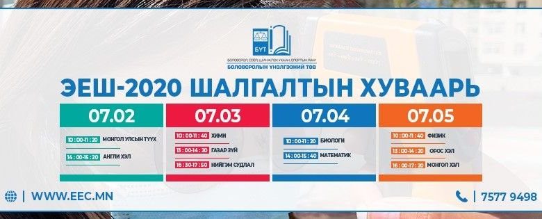 ЭЕШ-ыг долоодугаар сарын 2-ны өдөр 10:00 цагаас эхлэн Монголын түүх, англи хэл, долдугаар сарын 3-ны өдөр хими, газарзүй, нийгмийн ухаан, долдугаар сарын 4-ний өдөр биологи, математик, долдугаар сарын 5-ны өдөр физик, орос хэл, монгол хэлний шалгалт тус тус зохион байгуулна.