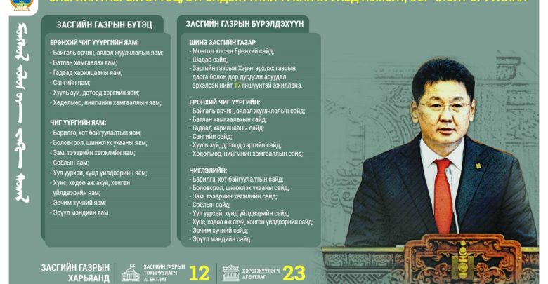 Засгийн газрын бүтэц, бүрэлдэхүүний тухай хууль тогтоомжийн төслүүд батлагдсанаар Улсын Их Хурлын гишүүн, Монгол Улсын Ерөнхий сайд У.Хүрэлсүхийн тэргүүлэх Засгийн газар бүтцийн хувьд ерөнхий чиг үүргийн 6, чиглэлийн 8, нийт 14 яамтай, бүрэлдэхүүний тухайд Монгол Улсын Ерөнхий сайд, Шадар сайд, Засгийн газрын Хэрэг эрхлэх газрын дарга болон асуудал эрхэлсэн нийт 17 гишүүнтэй ажиллахаар болов. Мөн шинэчлэн боловсруулсан “Төрийн захиргааны байгууллагын тогтолцоо, бүтцийн ерөнхий бүдүүвчийг батлах тухай” Улсын Их Хурлын тогтоол батлагдсанаар Засгийн газар тохируулагч агентлаг 12, хэрэгжүүлэгч агентлаг 23 ажиллах юм.