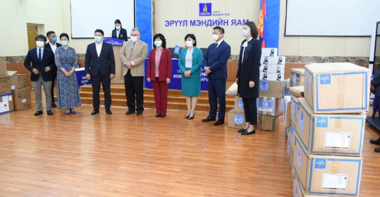 КОВИД-19 халдвартай тэмцэх үйл ажиллагаанд зориулж НҮБ-ын суурин зохицуулагч ноён Мишра Тапан, ДЭМБ-ын суурин төлөөлөгч Др. Сергей Диордица нар ЭМЯ-нд шаардлагатай хамгаалах хэрэгсэл болон тоног төхөөрөмжийг гардуулж өглөө.
