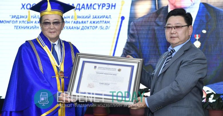 Монгол Улсын уул уурхай, хүнд үйлдвэрийн салбарт олон жил үр бүтээлтэй ажиллаж, хөгжлийн чухал хөтөлбөрүүдийг боловсруулж хэрэгжүүлэн, уул уурхайн салбарт эдийн засгийн үр өгөөжтэй шинэ техник, технологийг үйлдвэрлэлд нэвтрүүлэх, өргөжүүлэх замаар ШУТИС-ийн сургалт судалгааны ажлыг дэмжин, ШУТИС-ийн харьяа “Эрдэнэт цогцолбор” дээд сургуулийн статус, үйл ажиллагаанд оруулсан үнэтэй хувь нэмрийг үнэлэн “Эрдэнэт үйлдвэр” ТӨҮГ-ын Ерөнхий захирал, Техникийн шинжлэх ухааны доктор Х.Бадамсүрэнд ШУТИС-ийн “Хүндэт доктор” цол олгосныг өнөөдөр гардууллаа.