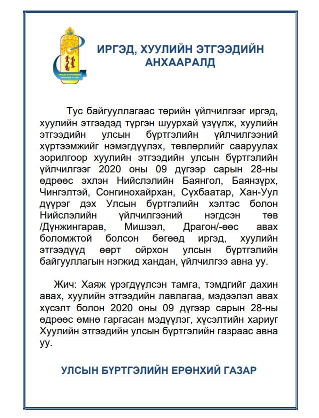 Улсын бүртгэлийн байгууллагаас төрийн үйлчилгээг иргэн, хуулийн этгээдэд түргэн шуурхай үзүүлж, хуулийн этгээдийн улсын бүртгэлийн үйлчилгээний хүртээмжийг нэмэгдүүлэх, төвлөрлийг сааруулах зорилгоор хуулийн этгээдийн улсын бүртгэлийн үйлчилгээг энэ сарын сарын 28-ны өдрөөс эхлэн Нийслэлийн Баянгол, Баянзүрх, Чингэлтэй, Сонгинохайрхан, Сүхбаатар, Хан-Уул дүүрэг дэх Улсын бүртгэлийн хэлтэс болон Нийслэлийн үйлчилгээний нэгдсэн төв /Дүнжингарав, Мишээл, Драгон/ -өөс үзүүлэхээр боллоо.