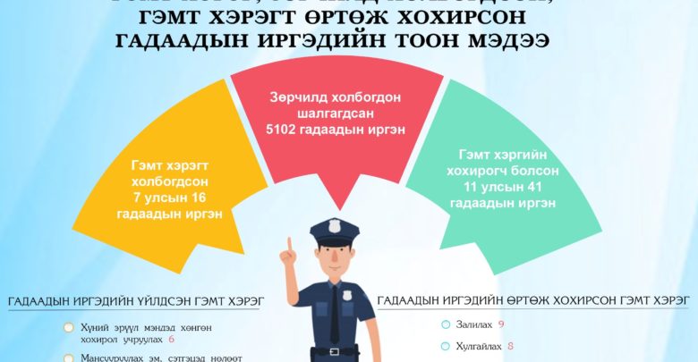 Цагдаагийн ерөнхий газрын Мэдээлэл, дүн шинжилгээ, шуурхай удирдлагын албаны мэдээгээр 2020 оны эхний 9 сарын байдлаар гэмт хэрэгт холбогдсон 7 улсын 16, зөрчилд холбогдон шалгагдсан 5102, гэмт хэргийн хохирогч болсон 11 улсын 41 гадаадын иргэн байна.