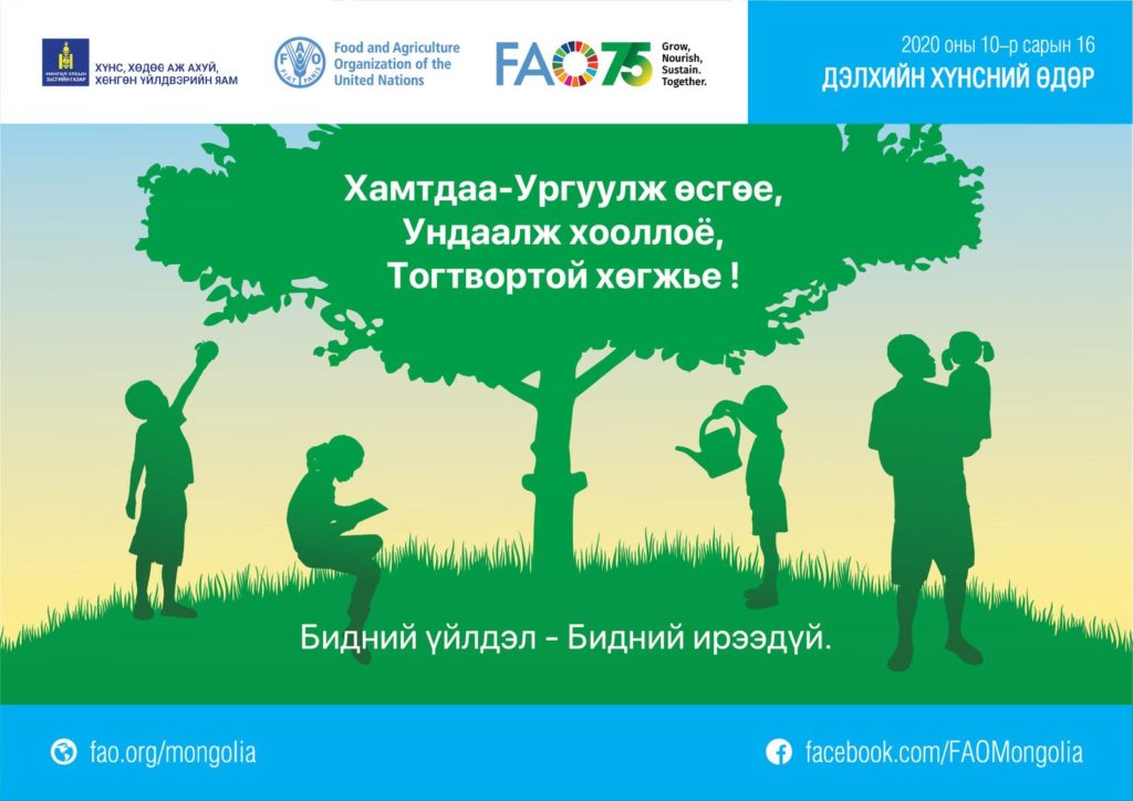 Өнөөдөр Дэлхийн хүнсний өдөр тохиож байна. Энэ өдрийг “Хамтдаа–Ургуулж өсгөе, Ундаалж хооллоё, Тогтвортой хөгжье” сэдвийн хүрээнд тэмдэглэж байна.