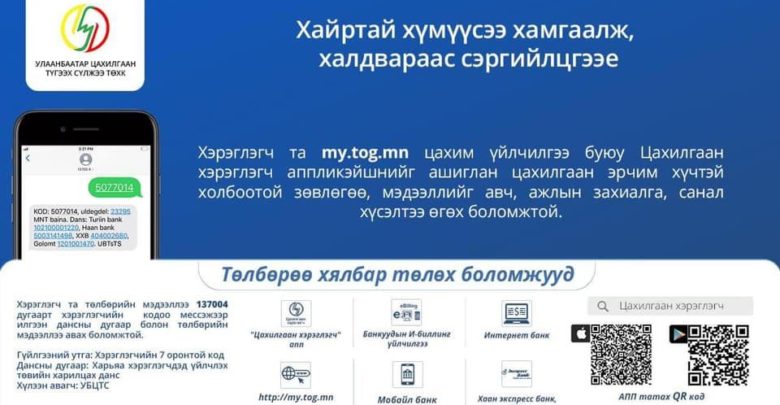 Хэрэглэгчдэд үйлчлэх төвүүд энгийн цагийн хуваарийн дагуу ажиллаж байгаа хэдий ч хэрэглэгч та өөрийгөө болон бусдыг эрсдэлд оруулалгүй цахим үйлчилгээ https://my.tog.mn/login, лавлах утас 70047004, UBEDN фэйсбүүк хуудасны ЧАТБОТ үйлчилгээ болон бүх банкны онлайн үйлчилгээ ашиглаж, цахилгаан эрчим хүчтэй холбоотой үйлчилгээг гэрээсээ авахыг зөвлөж байна.
