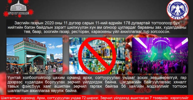 Фэйсбүүк орчинд 2020 оны 11 дүгээр сарын 14, 15-ны өдрүүдэд архи, пиво худалдаалахаар зар байршуулсан 17 хаяг, Цахим мөрийтэй тоглоом, бооцоот тоглоом зохион байгуулахаар мэдээлэл байршуулсан 28 хаягийг тогтоон цагдаагийн байгууллагаас шалган хариуцлага тооцон ажиллаж байна